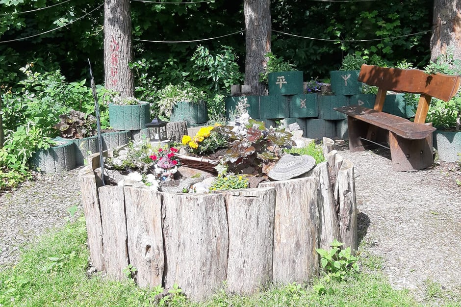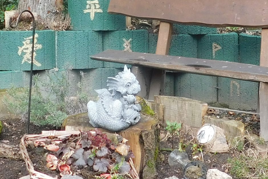 In Anlehnung an die chinesische Gartentradition haben wir mit der Drachenecke einen Ruheort geschaffen, der nicht zuletzt durch sein Windspiel alle Sinne anspricht. Der Duft der bunten Blumen in der Nase, das Rauschen des Windes und die Klänge des Windspiels im Ohr, die Wärme der Sonne im Gesicht. Das Gefühl der Erde bei der Arbeit im Drachenbeet ziwschen den Fingern. All das bringt uns Ruhe und Freude. Es tut gut!