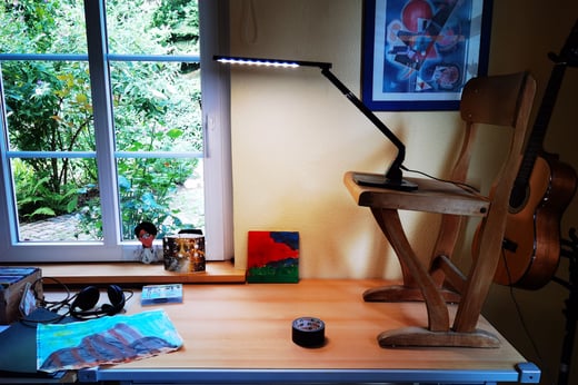 3. Wir haben das Foto-Set aufgebaut. Für das Set wurde ein Stuhl auf einen Tisch gestellt. Auf den Stuhl haben wir unsere Lichtquelle (eine Schreibtischlampe) gestellt und das Smartphone, das die Aufnahmen gemacht hat, mittels Panzertape befestigt. Ihr seht, man muss sich nur zu helfen wissen.