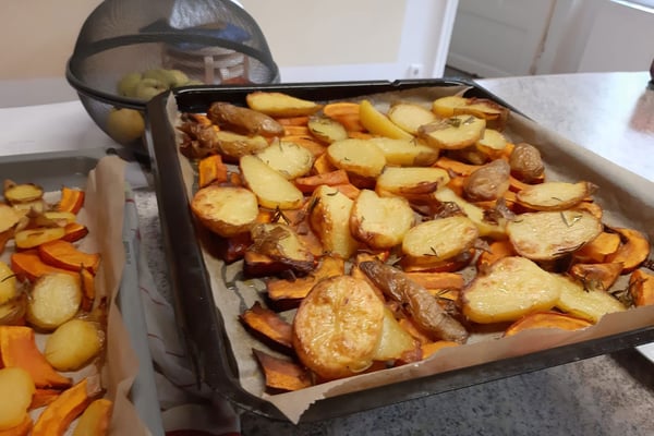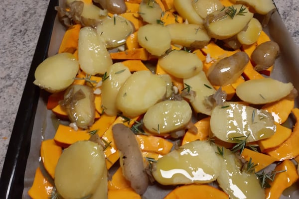 - Dann die vorgekochten Kartoffeln, den Kürbis, die Knoblauchzehen mit dem Olivenöl vermengen