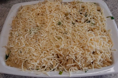 - Nudeln mit den Zwiebel- und Schinkenstücken vermengen und in die vorbereitete Auflaufform geben