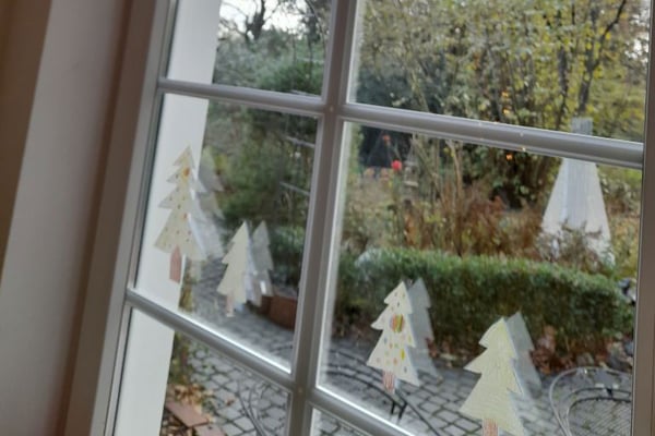 Die Sonnenhofkinder haben Fensterschmuck aus Tonpapier gebastelt. Am großen Fenster im Essbereich kleben sogar vier Kerzen aus Tonpapier, an deren Dochte die Kinder jeweils an einem Adventssonntag ein gebasteltes Flämmchen anbringen werden.